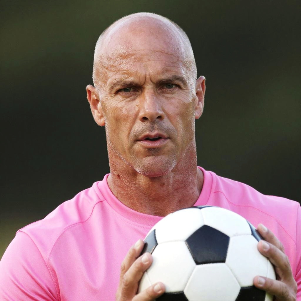 Close-up of a bald middle-aged man with a tanned complexion wearing a pink sports shirt, holding a black and white soccer ball. The background is blurred outdoor greenery.