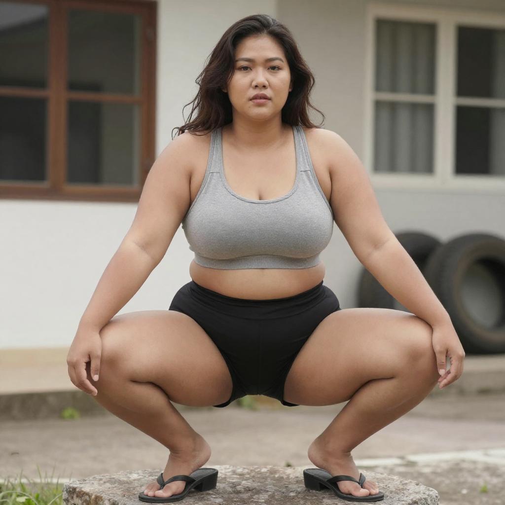Photograph of a plus-size Asian woman with long dark hair, squatting outdoors on a stone block. She's wearing a grey sports bra that accentuates her large breasts and black shorts. Her skin is light brown, and she has a confident expression. She's also wearing black flip-flops. The background includes a building with a window and some tires. The lighting is natural, and the overall vibe is casual and relaxed.