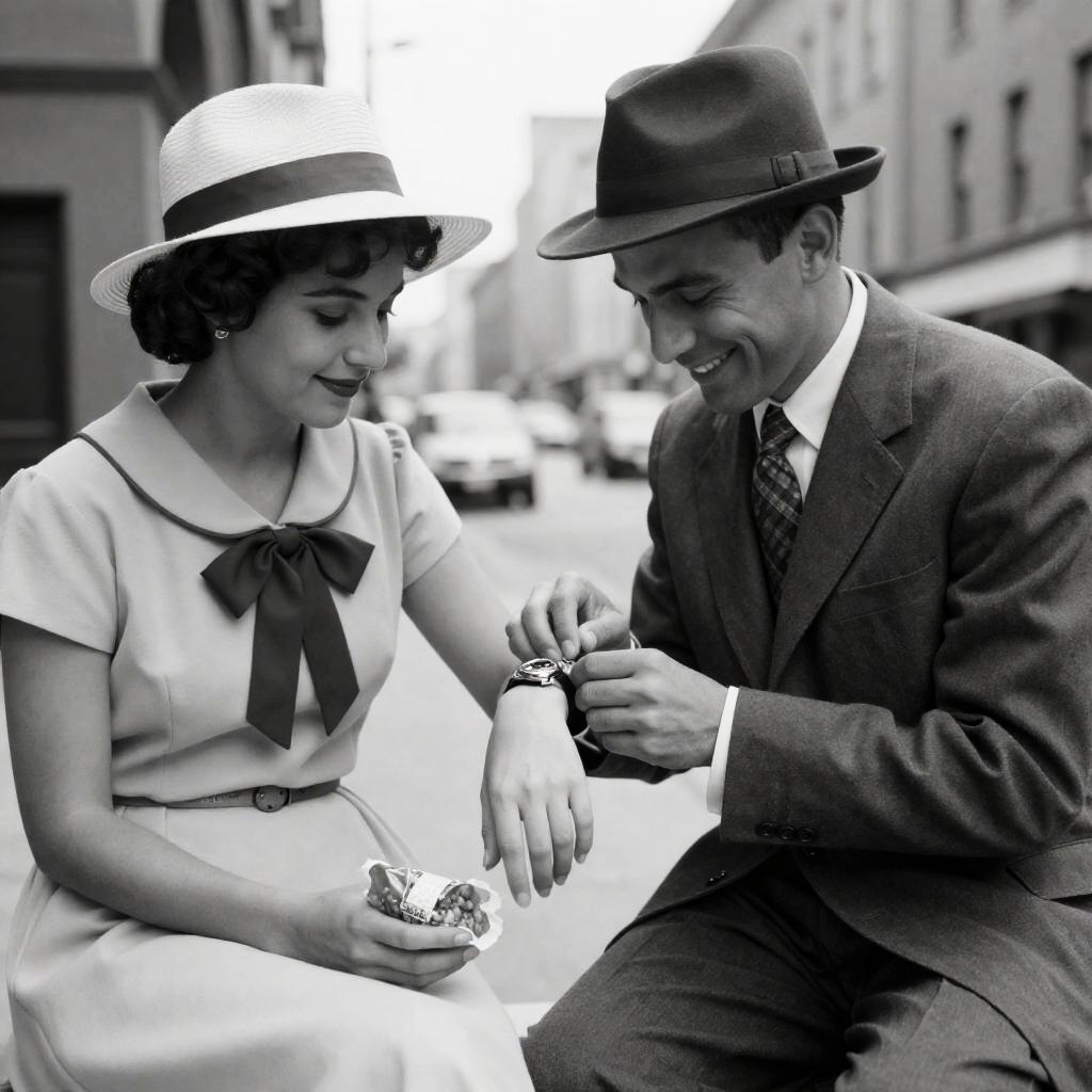 Black-and-white photograph of a smiling man in a suit and fedora, adjusting a woman's wristwatch. She has short curly hair, wears a wide-brimmed hat, light dress with a dark bow, and holds a wrapped snack. Urban background with buildings and cars. They sit close, facing each other, interacting warmly.