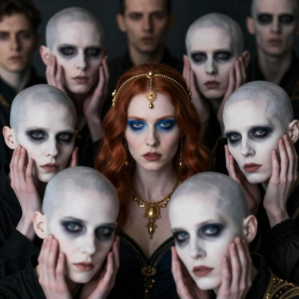 Photograph of a group of people with pale skin and intense expressions. Central woman with red hair, blue eye makeup, gold necklace, and gold headpiece. Surrounding people have eye makeup on hands, bald or partially bald, wearing dark clothing. Background people are blurred, creating depth. Foreground focuses on red-haired woman and people with eye makeup.