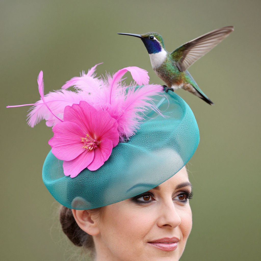 Woman wearing a teal fascinator adorned with a vibrant pink flower and whimsical pink feathers, complemented by a lifelike green hummingbird perched gracefully above her head.