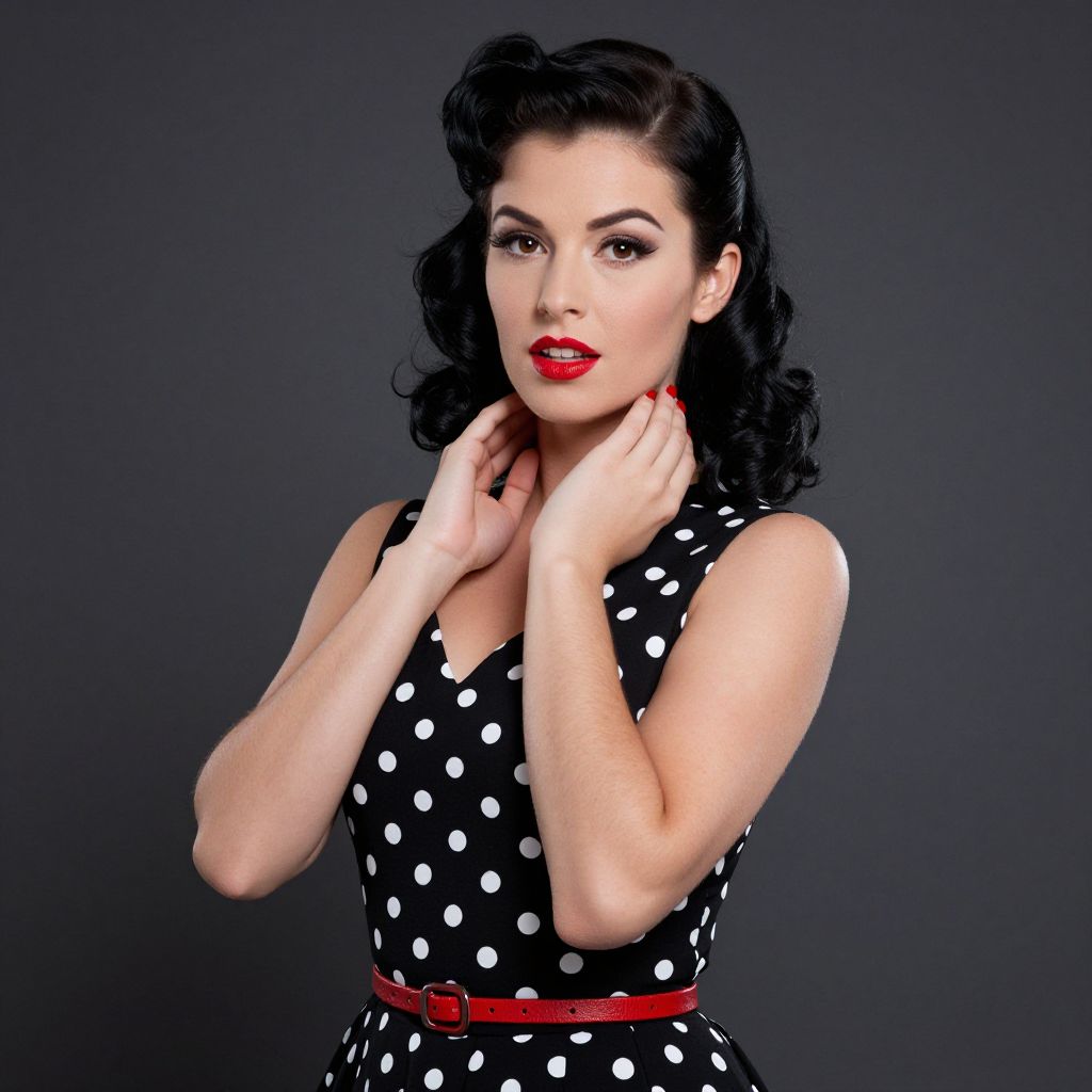 Photograph of a fair-skinned woman with black, wavy hair styled in a 1950s pin-up look. She's wearing a sleeveless black dress with white polka dots and a red belt, and has bright red lipstick and nail polish. Her hands are gently touching her neck, and she's looking directly at the camera with a confident expression. The background is a solid, dark gray.