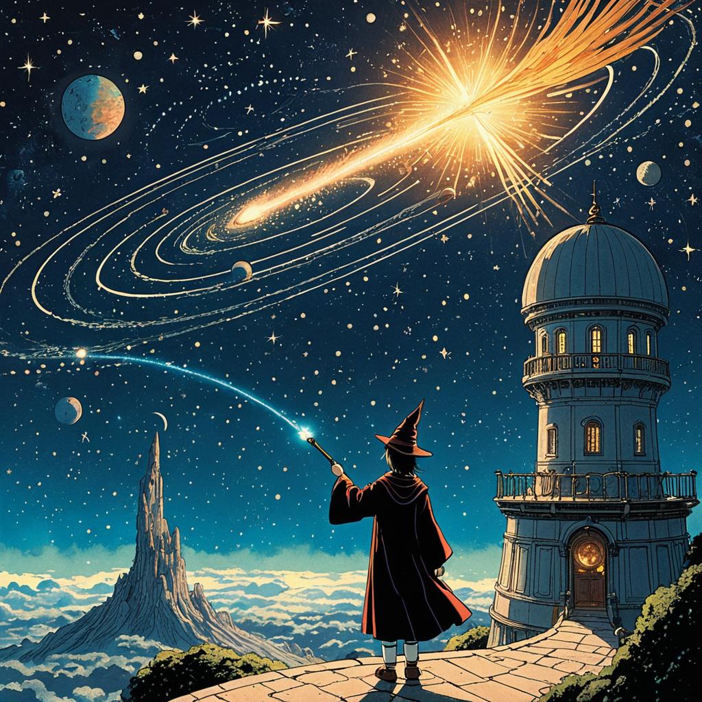 A bright-eyed owl, exploring a starry night sky, accompanied by a friendly comet, surrounded by shimmering constellations, illustrated in the dreamlike and heartwarming style of Hayao Miyazaki.
