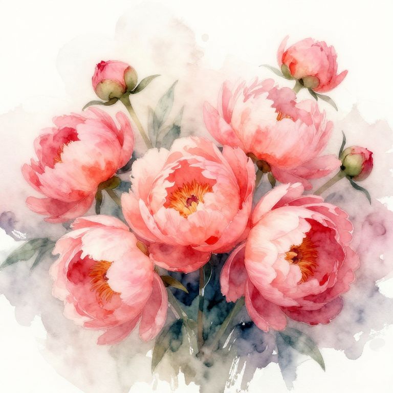 Watercolor peony bouquet with multiple flowers and buds, rich shades of pink and coral blending seamlessly, loose and expressive brushwork, subtle gradients creating depth, placed against a soft muted wash that enhances the romantic feel.