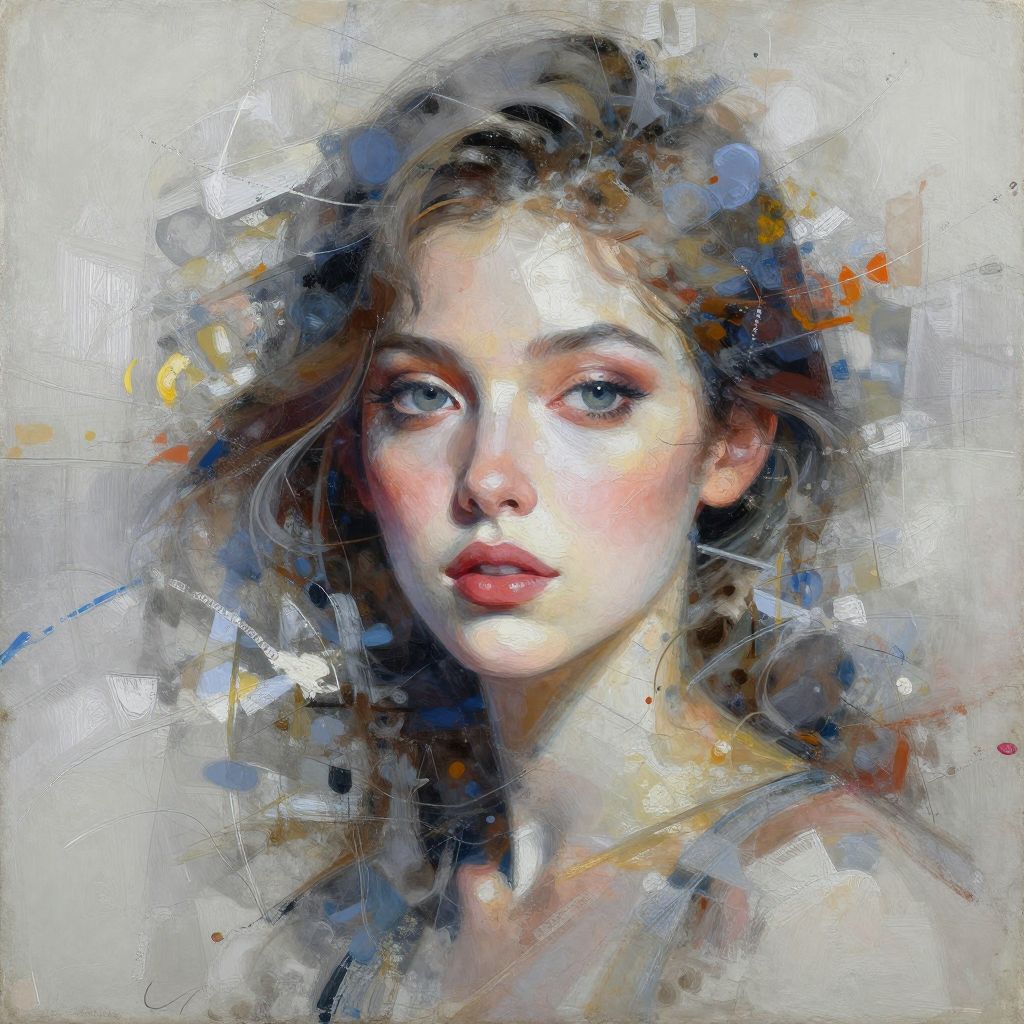 An abstract painting of a beautiful woman with delicate features, featuring splashes, blurs, and intricate brush strokes, creating a hyper maximalist and hyper realistic style.