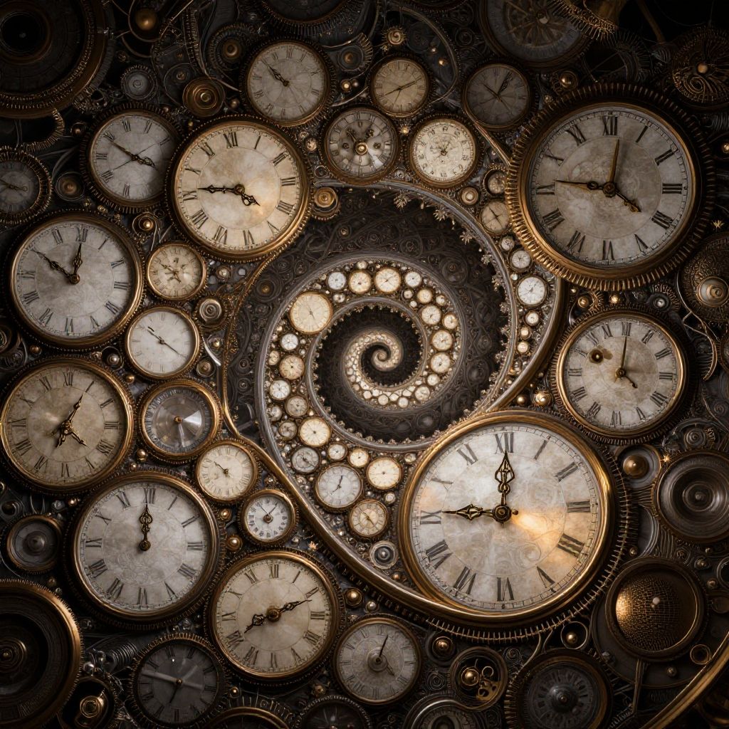 Beautiful abstract swirl of Time, clockpunk, clock faces everywhere, steampunk, clock faces in Infinity Fibonacci + fractal spiral spin.. Elegant abstract 3D digital art. Contrasted, beautiful light effects, artistic, perspective effects. cinematic, amazing, fractal, intricate details, HDR, beautifully shot, hyperrealistic, sharp focus, 64k, perfect composition, high contrast, cinematic, atmospheric, mood
