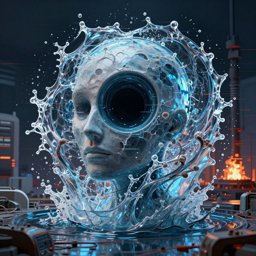 DonM8u663dXL, glitch art hyper detailed masterpiece, dynamic realistic digital art, awesome quality, hollow consciousness, water manipulation (controlling water flow and shape) blast furnace square, whispering realms of the mind distortion, time compression, relaxing