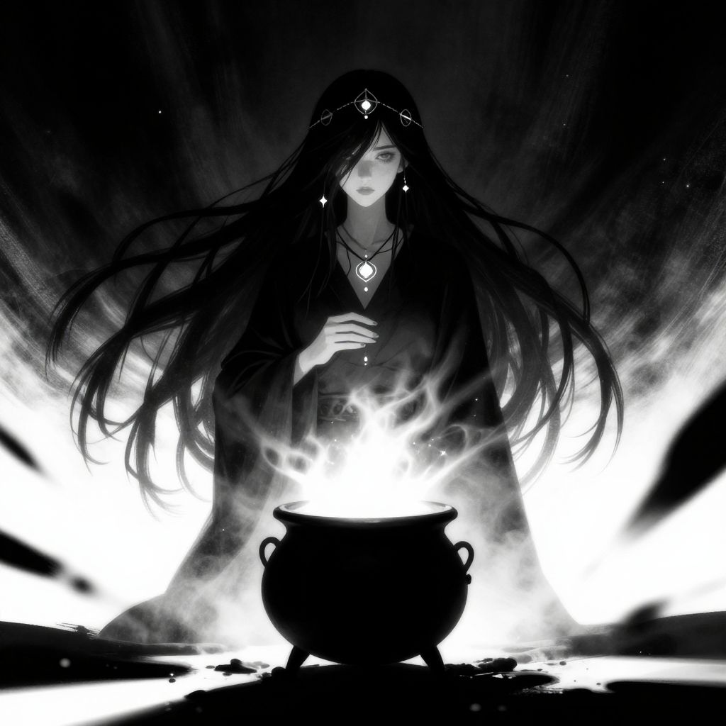 1 girl, long hair, atmospheric, geometric decorations, magic, witch, cauldron, gaze into the distance, sacrifice, intensive use of shadows, sharp contrasts, minimalistic compositions that create a sense of mystery + mood, illustration, combines elements of supernatural + occultism + mythology to create a unique blend of supernatural adventure + space horror, comic book quality, cinematic frame, dynamic camera angles, breathtaking background