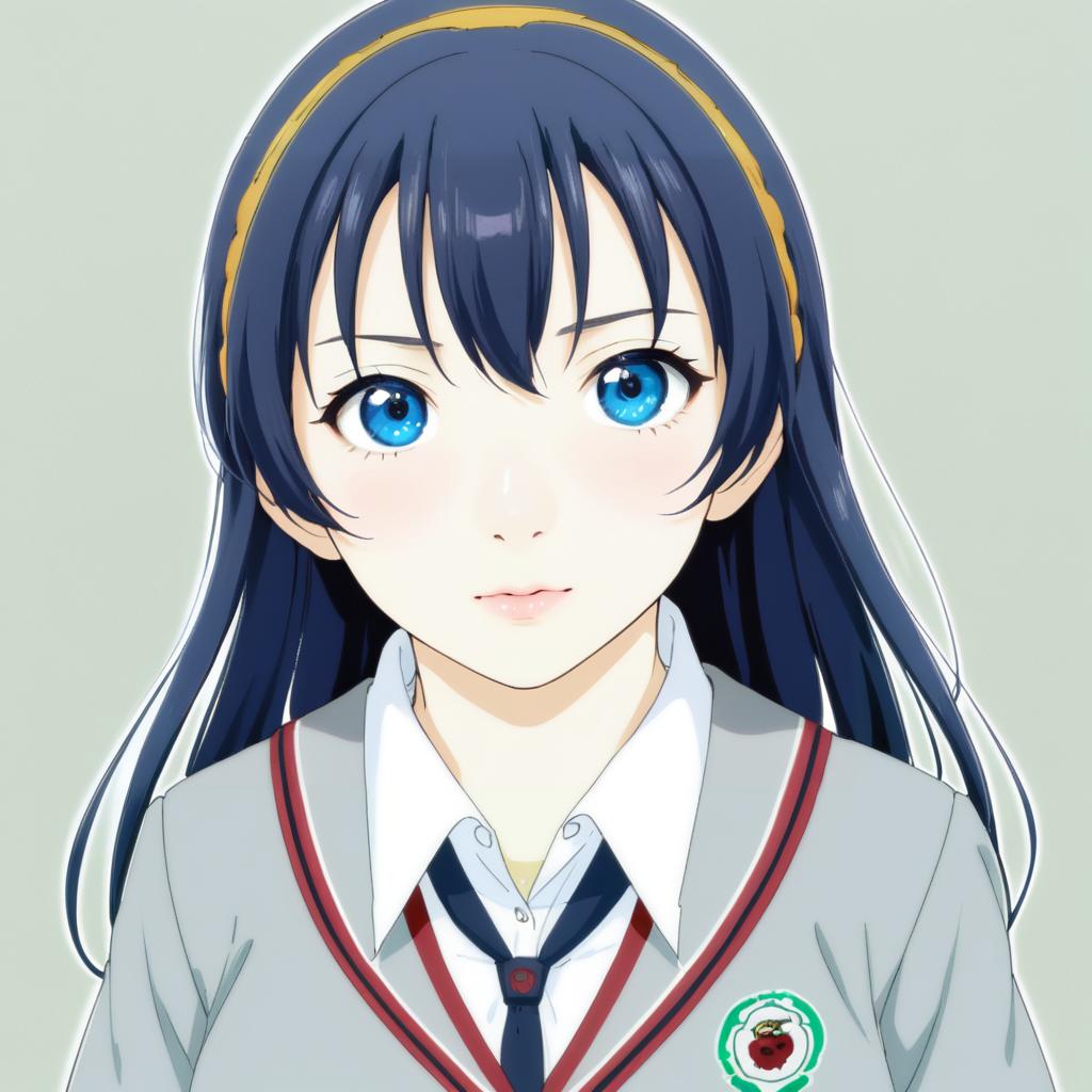 Close-up digital anime illustration of a young female character with long black hair and vibrant blue eyes. She is wearing a Kibito High School uniform consisting of a grey blazer with red stripes, a white collared shirt, and a navy blue tie. The girl has a yellow hairband and a school emblem pinned on her blazer. The art style is detailed and polished, inspired by the artist Nagayama Yuunon.