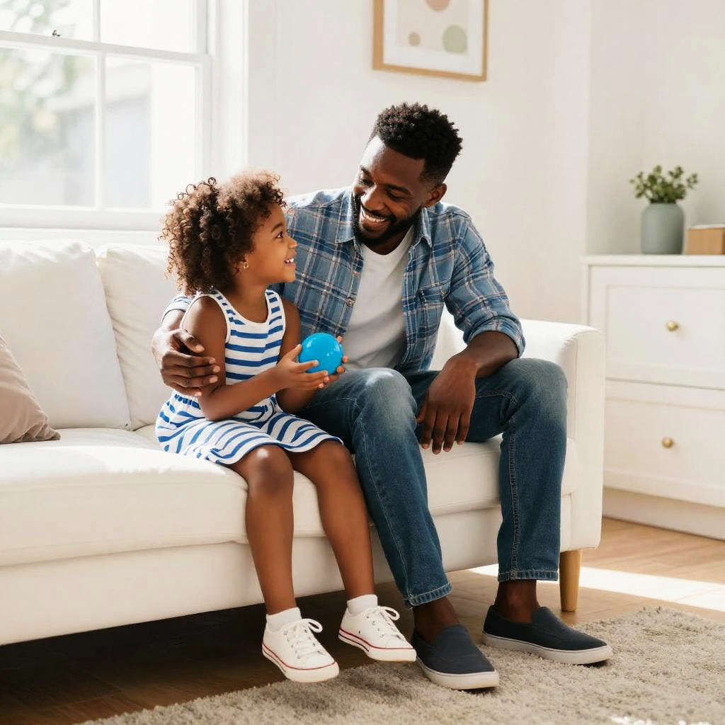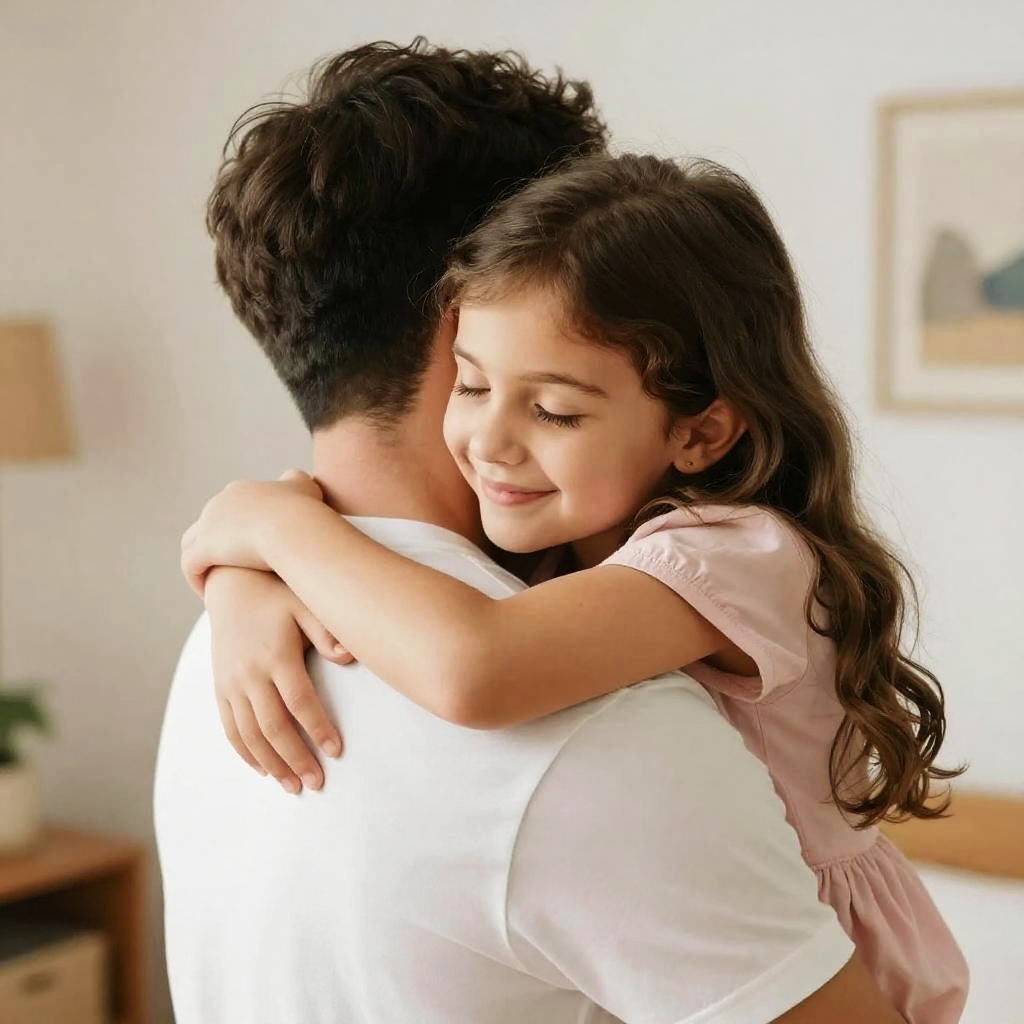 A warm, intimate photograph of a young girl with long, wavy brown hair hugging a man from behind. She's smiling softly with closed eyes, wearing a pink shirt. The man, with short dark hair, is dressed in a white shirt, his back to the camera. They're standing in a softly lit room with blurred, cozy background elements. The image feels tender and loving.
