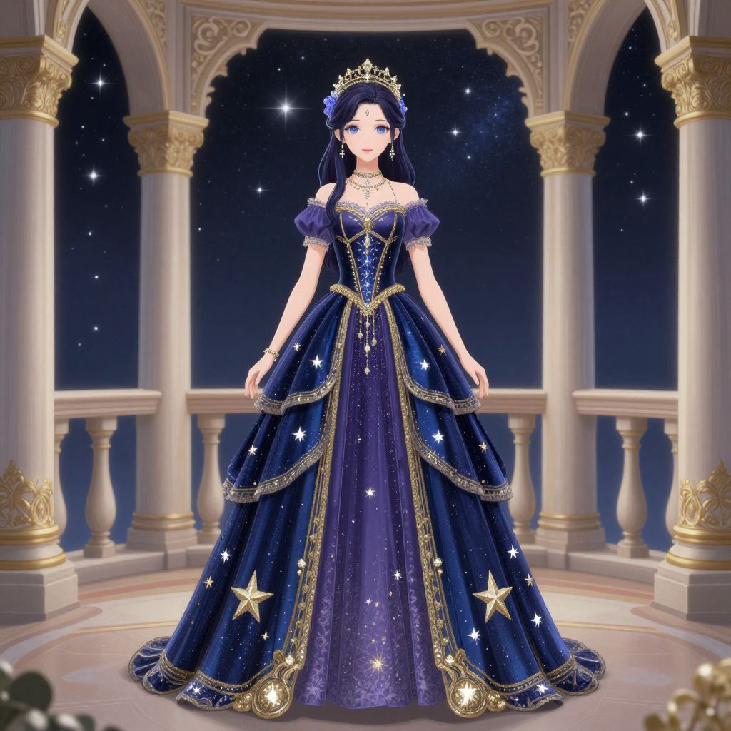 Digital illustration of a fair-skinned, blue-eyed woman in an ornate, star-patterned dark blue ball gown with gold trim, standing in a
