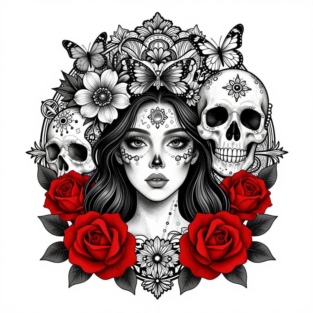 This is a digital drawing in a monochromatic black and white style with vibrant red accents. The central figure is a detailed, black and white portrait of a woman with wavy, dark hair and intricate facial tattoos. Her eyes are large and expressive, framed by floral patterns. She is surrounded by a crown of intricately drawn flowers, butterflies, and two prominent skulls. Below her face, three bold red roses with dark green leaves contrast sharply with the black and white background. The overall composition combines gothic and floral elements, creating a striking, macabre beauty.