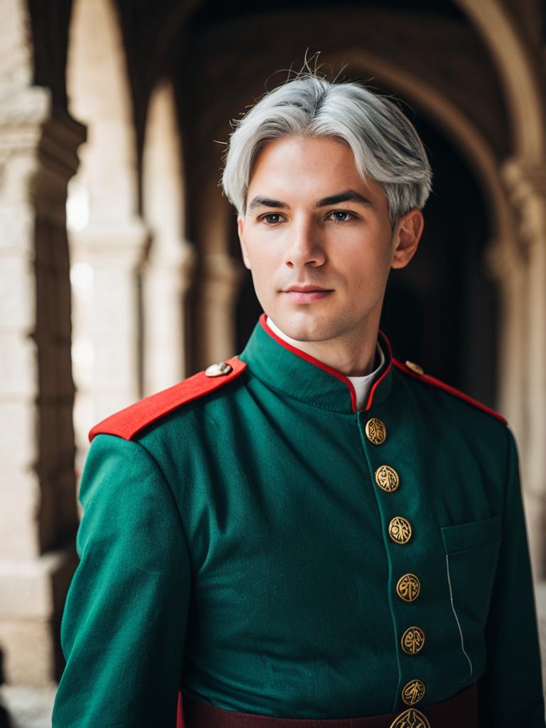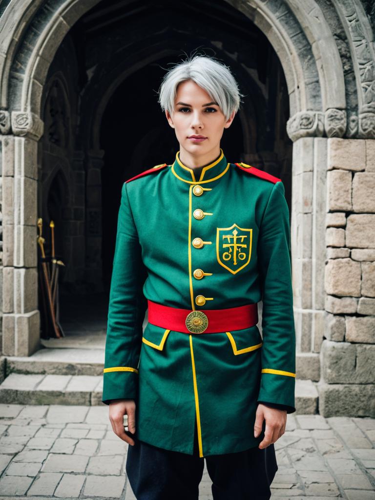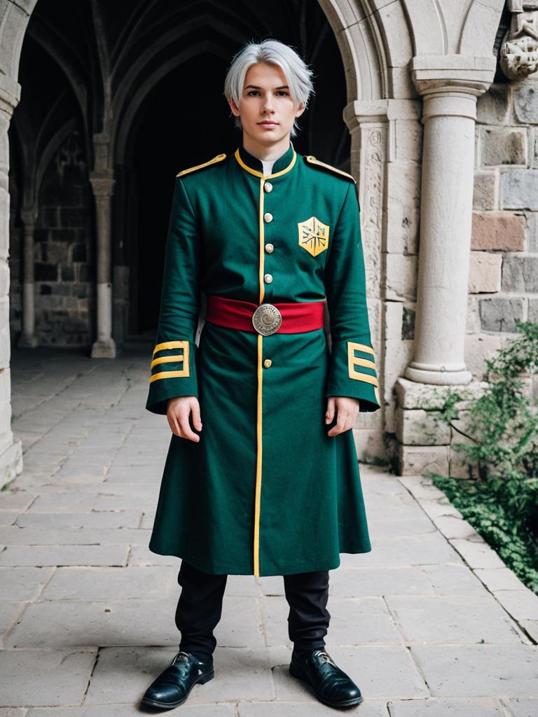Photo-realistic cosplay photo of person in ashe ubert costume. 1boy, green eyes, grey hair, freckles, garreg mach monastery uniform, uniform, garreg mach monastery uniform, uniform. full body shot