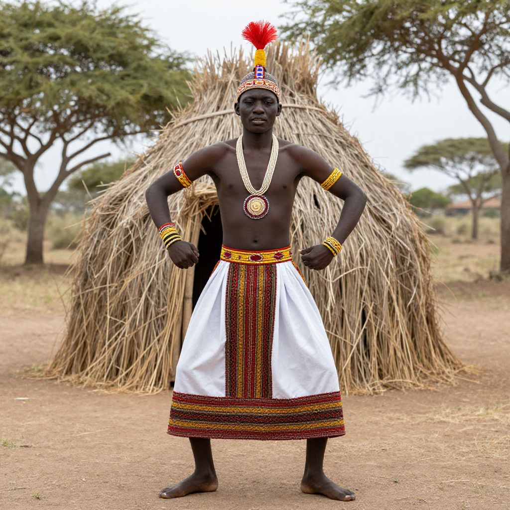 "Zulu Dance Costume, man in a native dress standing in front of a hut"