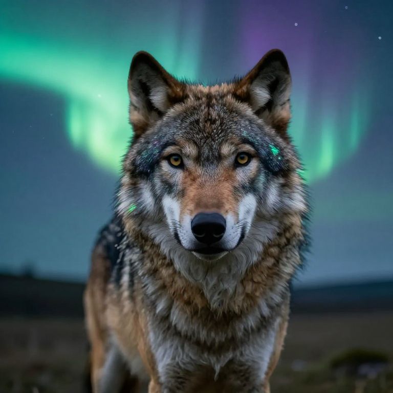 Photograph of a wolf with intense eyes, standing in front of a vibrant northern lights display, showcasing detailed fur and a striking, colorful aurora background
