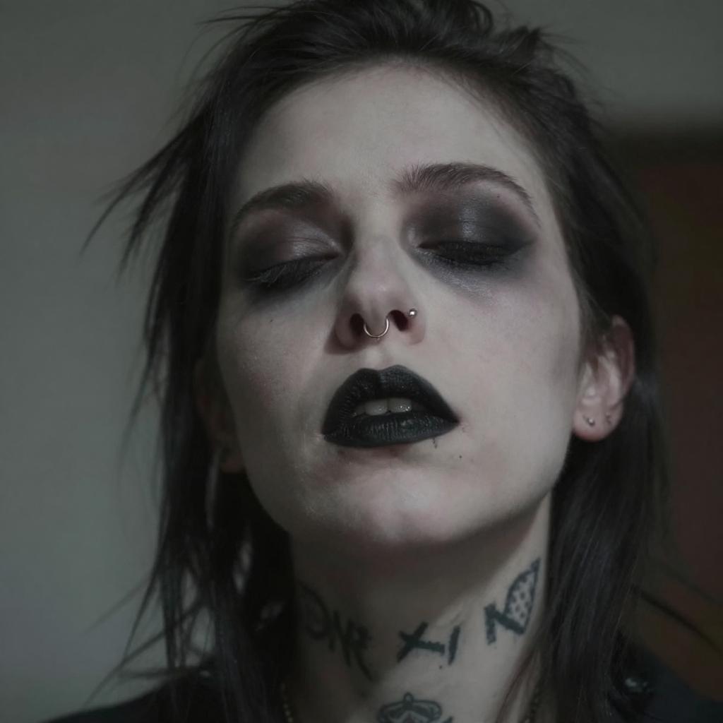 This is a close-up, slightly low-angle photograph of a creepy, pale-skinned person with dark, heavy makeup, closed eyes, and black lipstick. They have a nose ring and tattoos on their face. Their hair is short and spiky. The background is blurred, creating a shallow depth of field that makes the face the focal point. Lighting is soft, casting gentle shadows that enhance the eerie mood. The person's expression is neutral, almost lifeless.