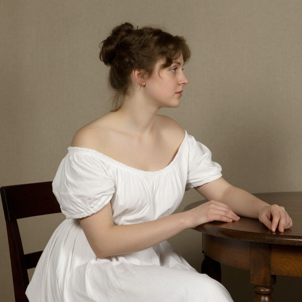 Woman seated in profile, wearing a white off-the-shoulder dress with puffed sleeves, her hands resting on a polished wooden table as she gazes thoughtfully to the right, captured in a classic portrait style reminiscent of Anders Leonard Zorn's \"Emma.\