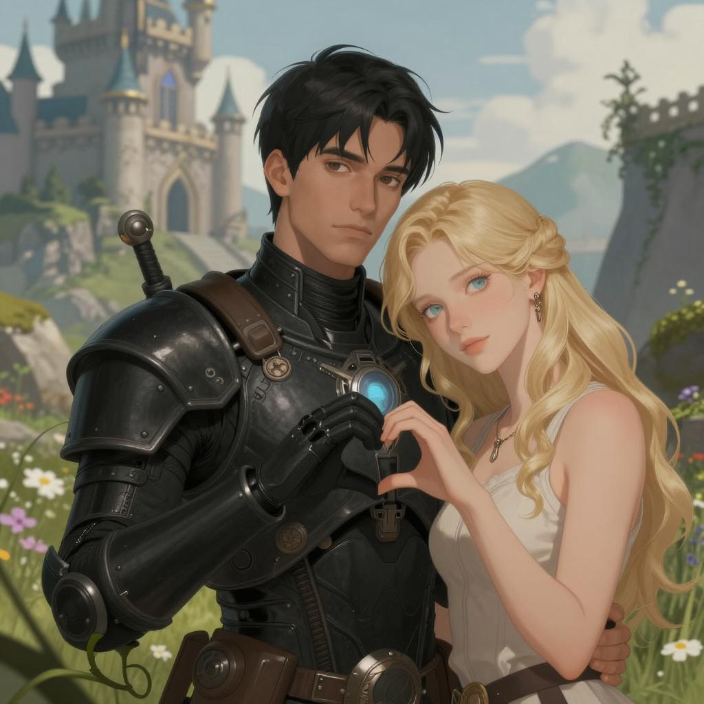 Illustration of a pale, black-haired man with dark eyes, wearing a black, detailed, mechanical chest plate. A blonde woman with light skin and blue eyes leans on him, hands forming a heart over his chest. Background: fantasy castle on a rocky hill, greenery, flowers, and a cloudy sky. Woman's expression is gentle, man's is neutral. Both have intense gazes. Green vines in the foreground. Two people.