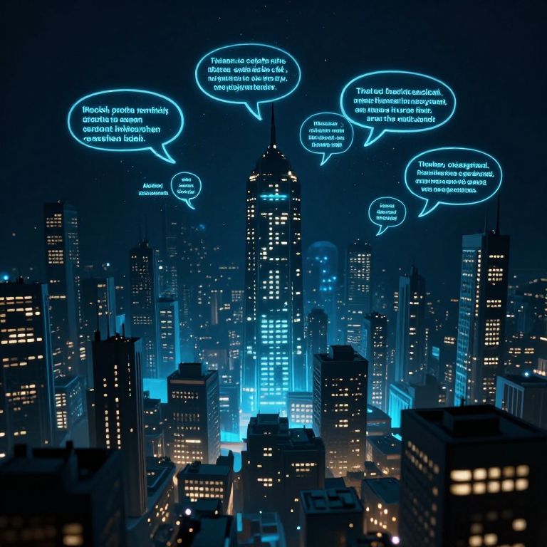 Digital artwork of a glowing blue-lit cityscape at night with speech bubbles in Portuguese, featuring skyscrapers and illuminated windows.