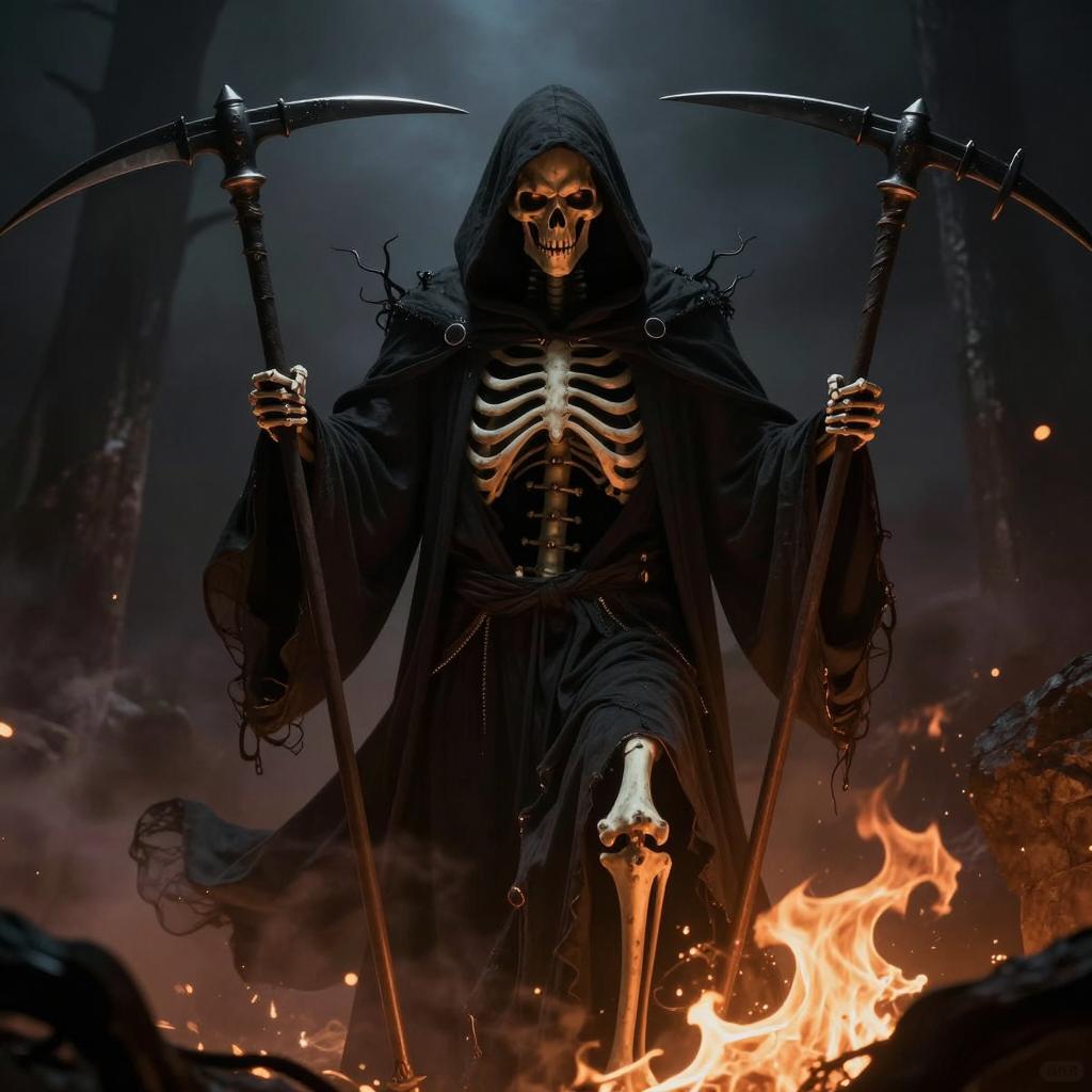 Abstraction The Grim Reaper is a tall, imposing figure, with a skeletal frame and glowing eyes that seem to pierce through the darkness. He is often depicted wielding two scythes, one in each bony hand, which he wields with deadly precision. His long, flowing black robe billows around him as he moves, adding to his eerie and foreboding presence. Despite his skeletal appearance, the Grim Reaper exudes an air of power and authority, inspiring both fear and awe in those who encounter him. Fire burning the lower part of his body,