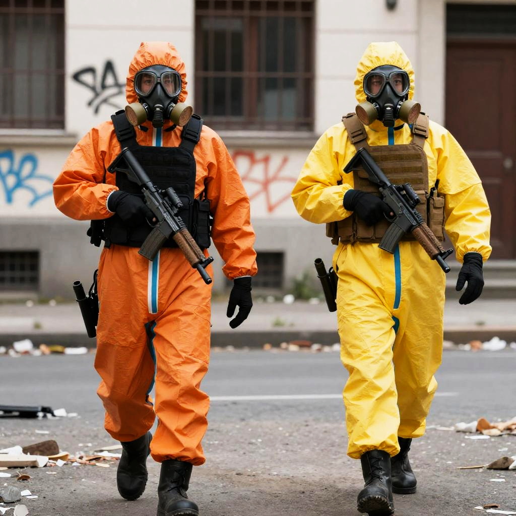 Two armed individuals in hazmat suits, one in orange and one in yellow, walking on a littered street. Both wearing gas masks and tactical vests, holding guns. Background includes a building with barred windows and graffiti. Scattered debris on ground. Intense expressions.