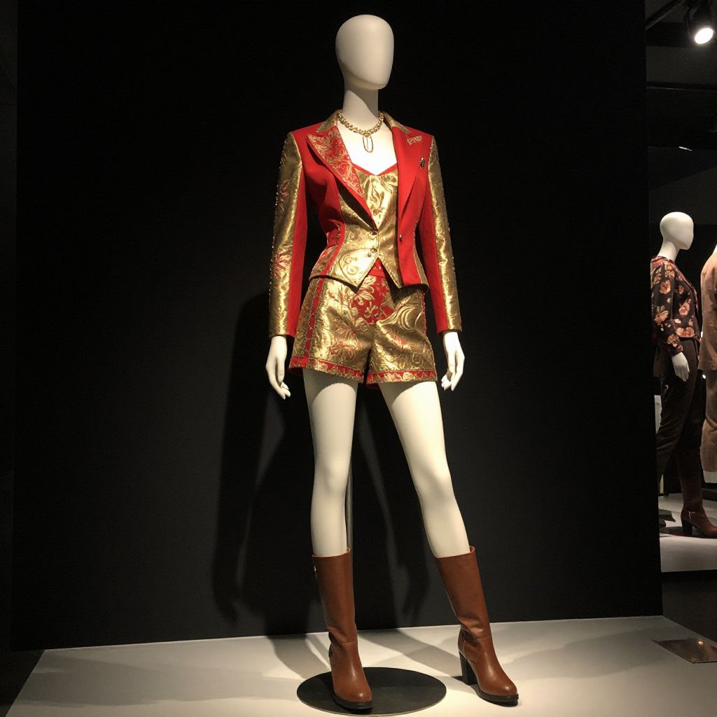 A mannequin wearing a red and gold outfit with brown boots, standing in a stylish, high-fashion setting with dramatic lighting and intricate details, showcasing the vibrant colors and elegant design of the outfit. The mannequin's expression is confident and poised, emphasizing the sophistication of the look. The scene is designed to highlight the clothing's luxurious materials and the mannequin's refined posture, creating a striking visual that captures the essence of high-end fashion.