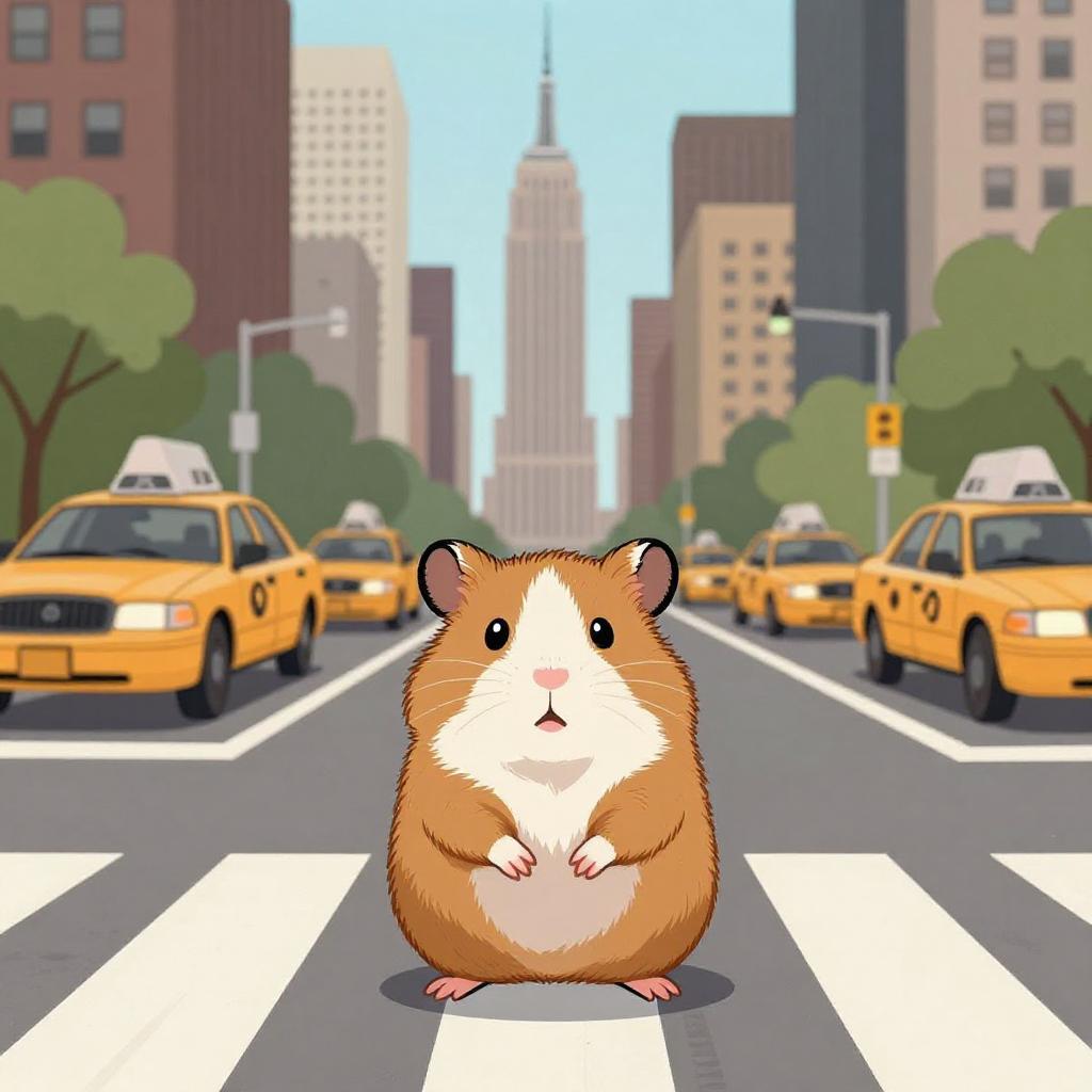 Illustration of a brown and white hamster standing on a pedestrian crosswalk with yellow taxis and skyscrapers in the background, including the Empire State Building, set in New York City.