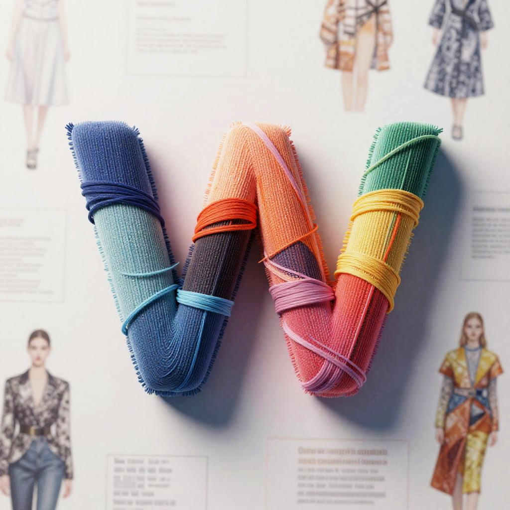 Clothing font generator concept, futuristic typography designed with fabric texture effects, vibrant colorful threads weaving through letters, soft shadows and 3D depth, background of fashion sketches and garment patterns, modern artistic style