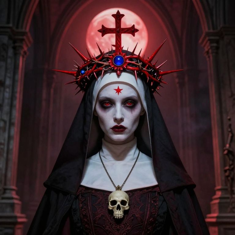 The image depicts a striking portrait of a nun, adorned with a complex and elaborate headdress that resembles a cross between a crown and a thorny crown, evoking a sense of otherworldliness. The headdress is predominantly red with sharp, spiky protrusions, and a central blue orb, adding a surreal and menacing quality to the figure. The nun's face is pale, with red eyes that exude a haunting gaze, and a small red star on her forehead, further enhancing the mystical aura. She is dressed in a dark, gothic robe with intricate patterns, and a skull pendant hangs around her neck, symbolizing mortality and the macabre. The background features a gothic architectural setting with tall, pointed structures, reminiscent of medieval cathedrals, and a red moon in the sky, casting an eerie glow over the scene. The overall composition is balanced, with the nun centrally positioned, and the architectural elements framing the image, creating a sense of depth and perspective. The interplay of colors, textures, and shapes contributes to a visually rich and complex scene, evoking themes of the occult and the supernatural.