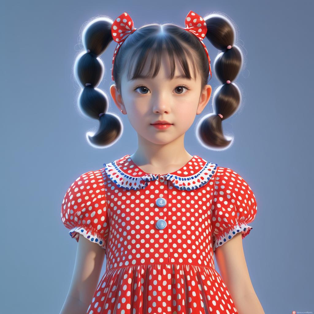 Portrait of a young girl with pigtails wearing a playful polka dot dress. Styled by Mary Cassatt, Dr. Seuss, Hayao Miyazaki with hyperrealistic, volumetric light, rendered in Octane.