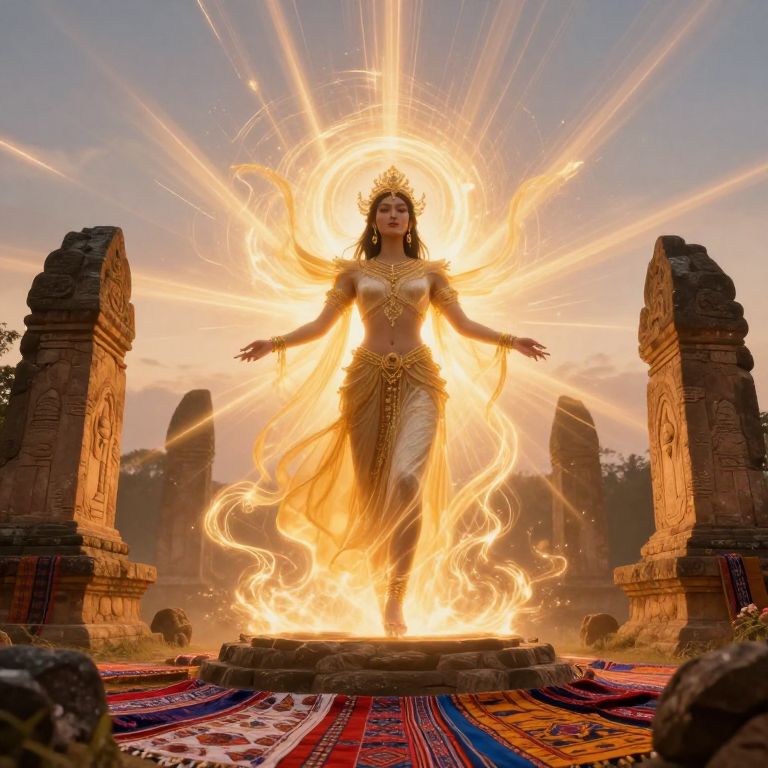 Photograph of a deity-like woman standing in a fiery halo at the center of an ancient stone temple. She wears a gold crown, ornate necklace, and a flowing white and gold dress adorned with intricate patterns. Her arms are outstretched, surrounded by bright, radiant flames. The background features two tall, weathered stone pillars and a colorful, patterned rug on the ground. The sky is a soft blue at sunrise or sunset, adding a warm glow to the scene. The image has a magical, otherworldly feel.