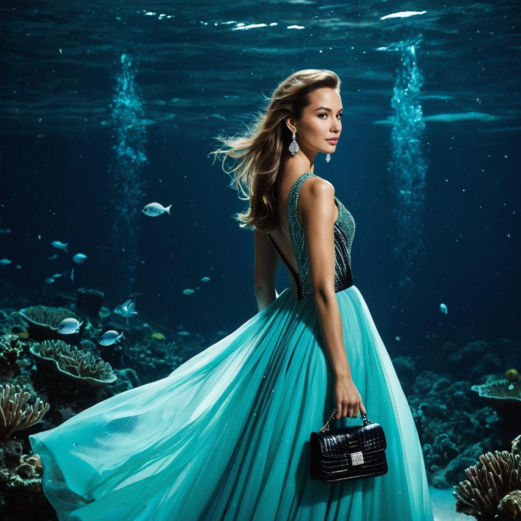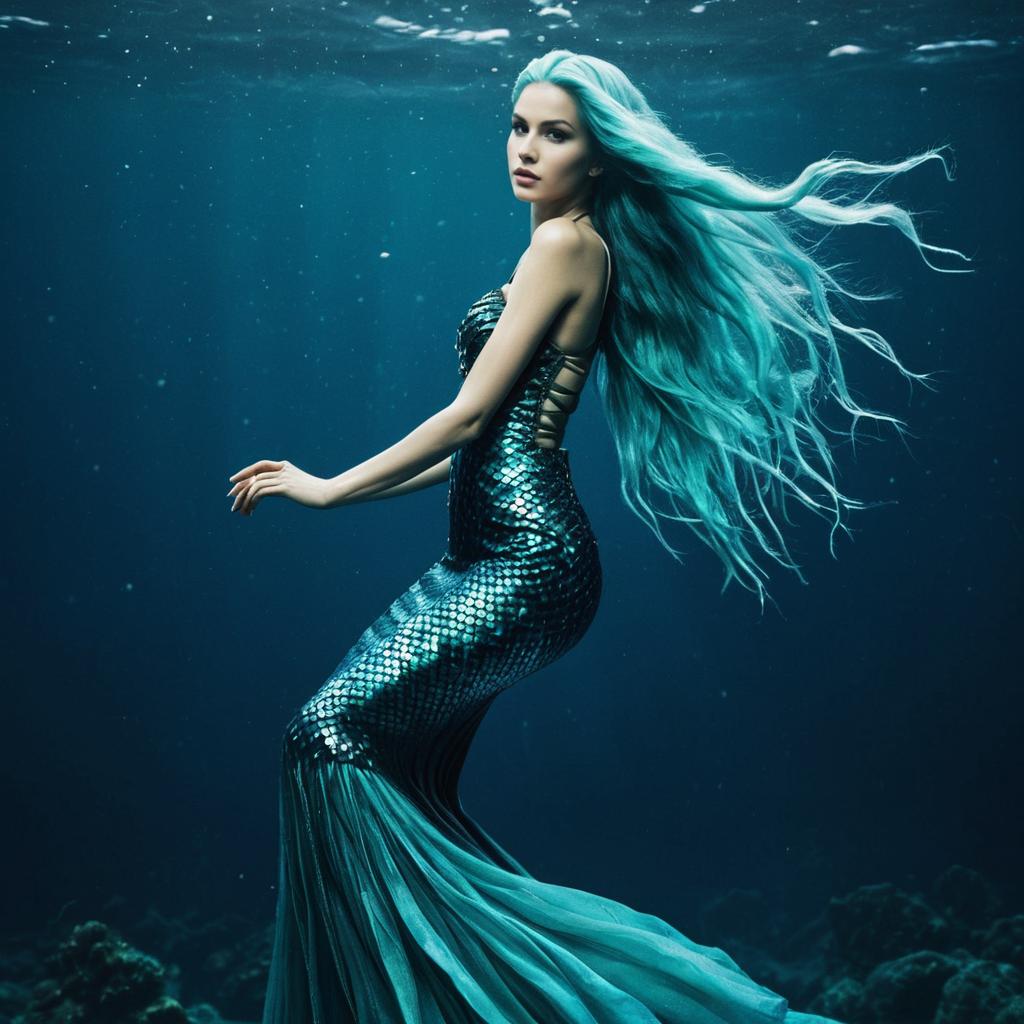Slender woman with distinctive facial features wearing a sparkling aquamarine bioluminescent gown, diamond ring, and gemstone earrings. Her long, flowing hair moves elegantly underwater, set against a dark ocean background with coral and fish.