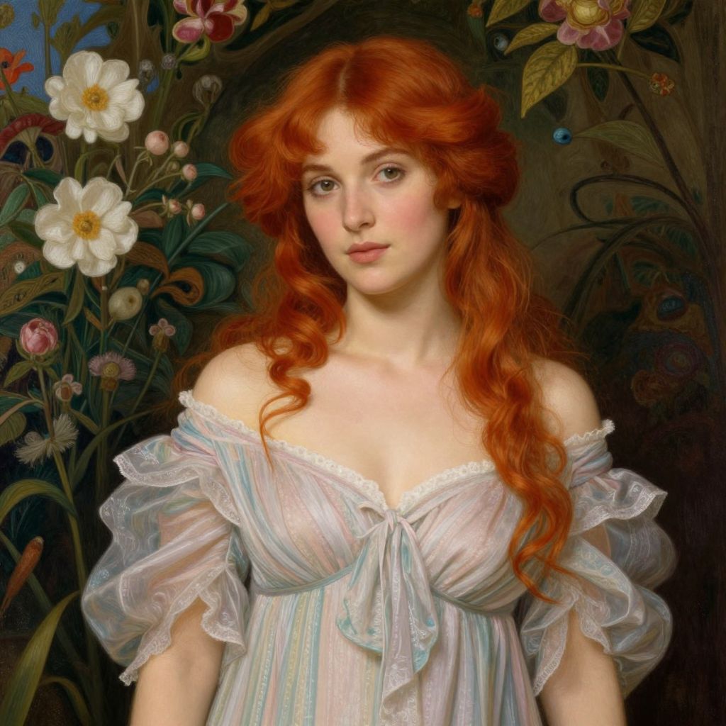 A digital illustration inspired by Dante Gabriel Rossetti's style, featuring a woman with vibrant red hair and a vintage off-the-shoulder dress, set against a lush, floral backdrop with a romantic, high-definition aesthetic reminiscent of Pre-Raphaelite art.