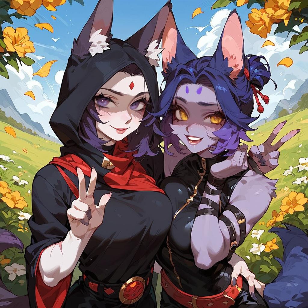 (score_9, score_8_up), score_7_up, score_6_up, score_5_up, score_4_up, Raven Team Leader, 2girls, masterpiece, best quality, purple hood, faceless, shaded face, animal ears, dark skin, purple skin, scar on eye, (furry), (body fur:1.2), purple fur, belt, straps, smile, blushing, v, peace sign, outdoors, plains, flowers