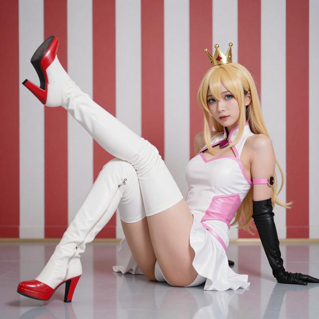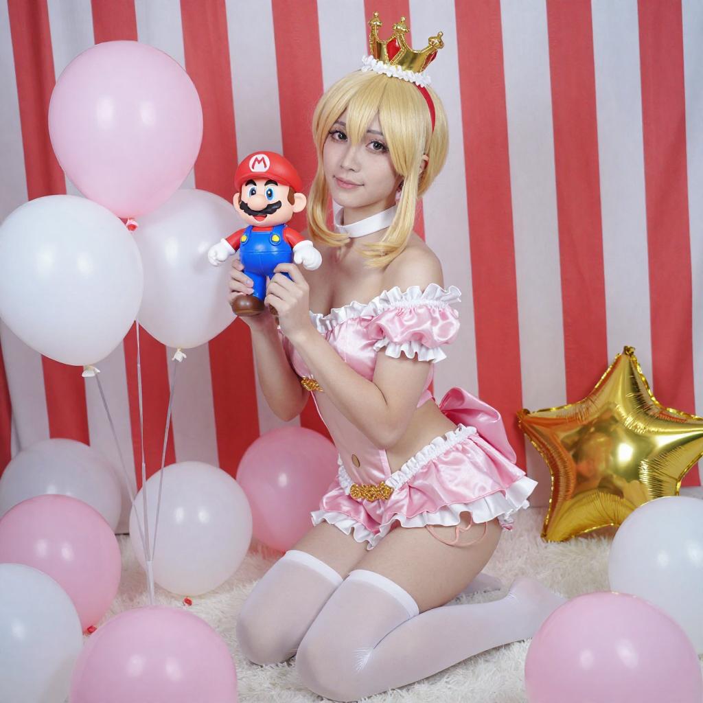 A blonde cosplayer with blue eyes, wearing a white and pink outfit with a crown, sits on the floor amidst red and white streamers. She holds a red balloon, with another balloon in the foreground. Her pose is relaxed, with one arm resting on her knee. The setting is brightly lit, creating a festive atmosphere.