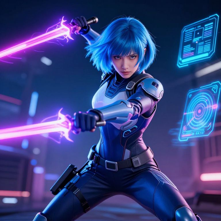 Dynamic action shot of a blue short hair girl in a futuristic battle suit, wielding energy blades, neon holograms and digital interfaces surrounding her, intense expression showing determination, cinematic science fiction style with dramatic lighting