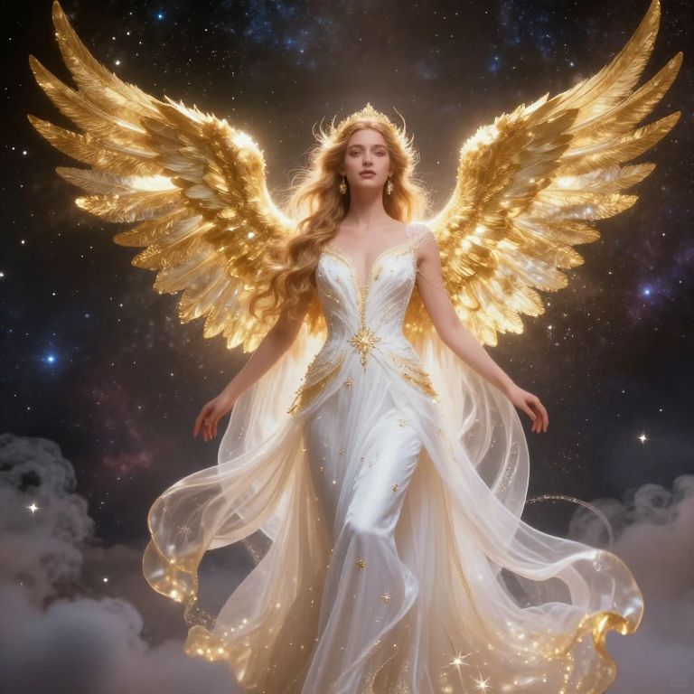 Digital art of a radiant angelic woman with golden wings, flowing white gown, and crown, glowing in a starry, cosmic background.