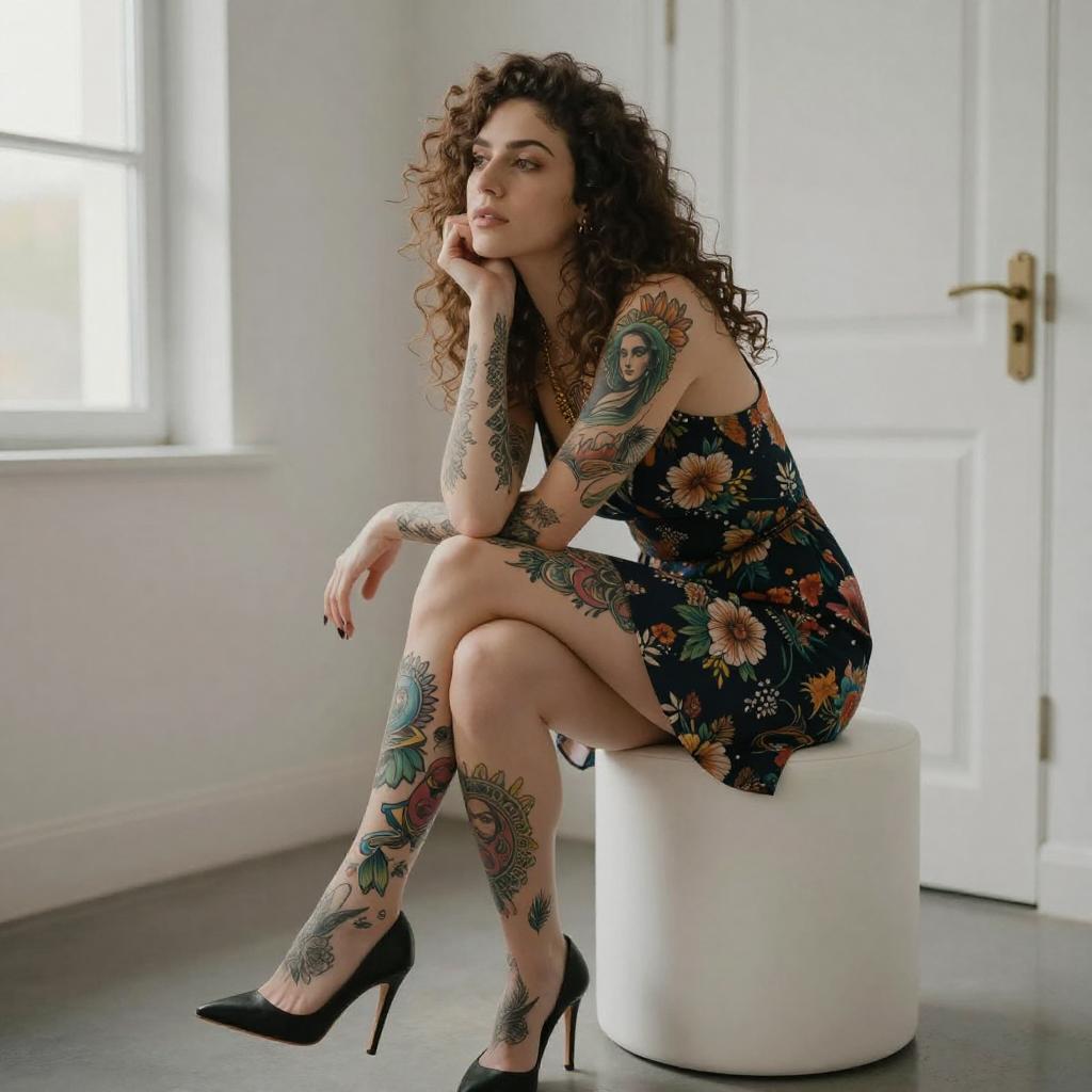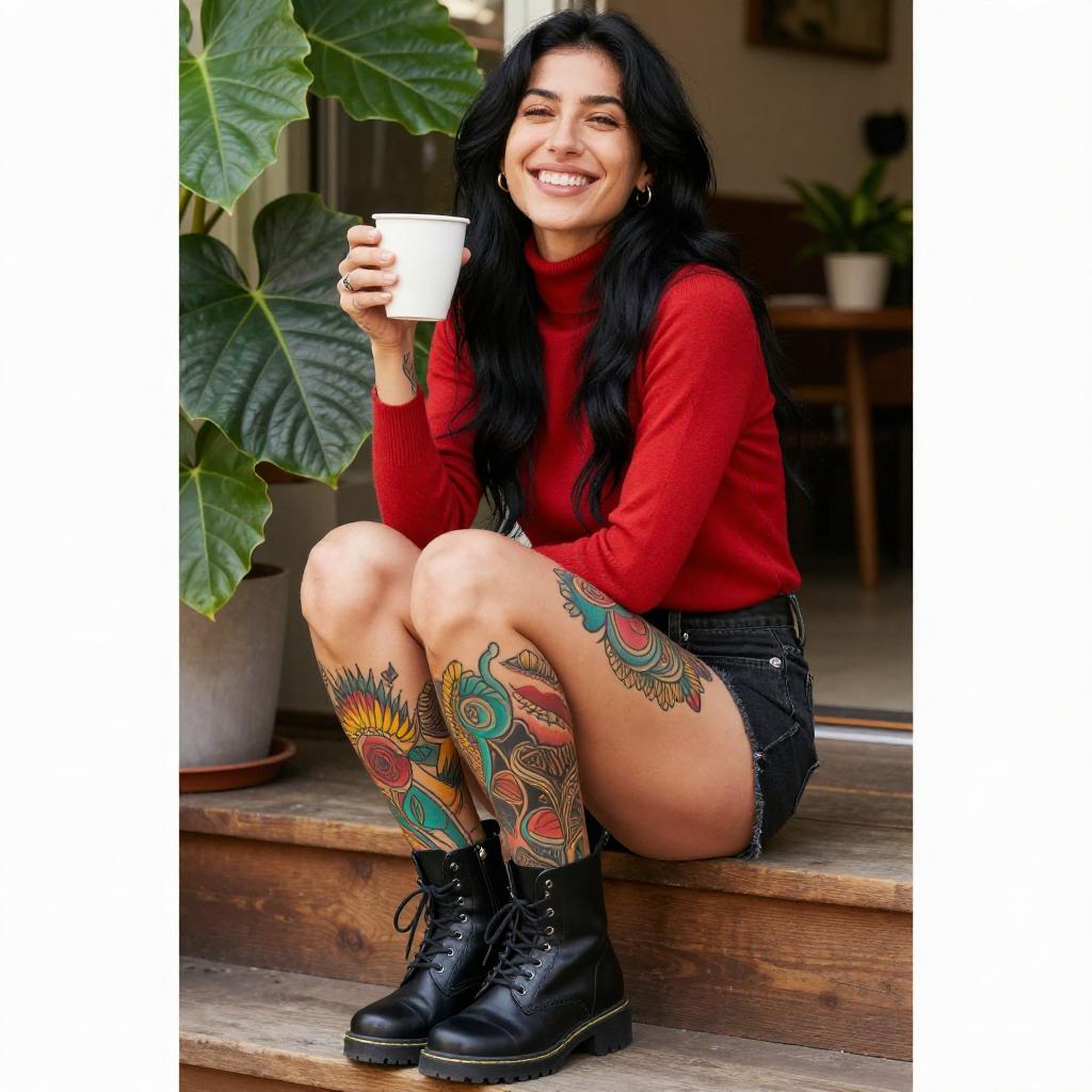 Photograph of a smiling woman with long black hair, wearing a red turtleneck and black boots, sitting on wooden steps. She has colorful, intricate tattoos on her legs and holds a cup in her right hand. Green leaves and a potted plant are in the background. Sunlight highlights her relaxed, happy demeanor.