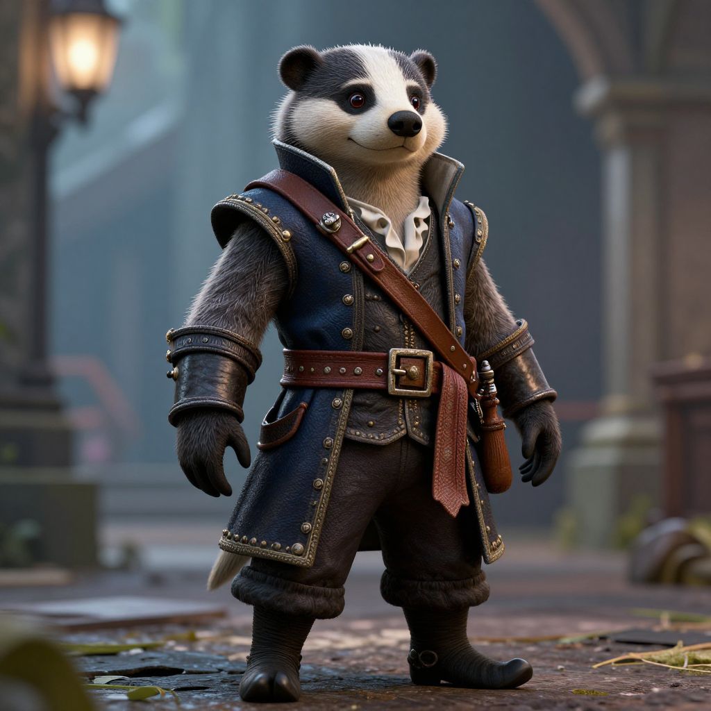 Digital artwork of an anthropomorphic badger standing in a dimly lit, medieval-style alley. The badger wears a detailed, dark blue, leather armor with gold trim, brown belt, and a white shirt underneath. Its black and white fur contrasts with the dark attire. The background features blurred, stone archways and a glowing street lamp, enhancing the mystical atmosphere. The texture of the leather and fur is highly detailed, giving a realistic yet fantasy-like appearance. The badger's expression is neutral, and it stands confidently on a cobblestone path.
