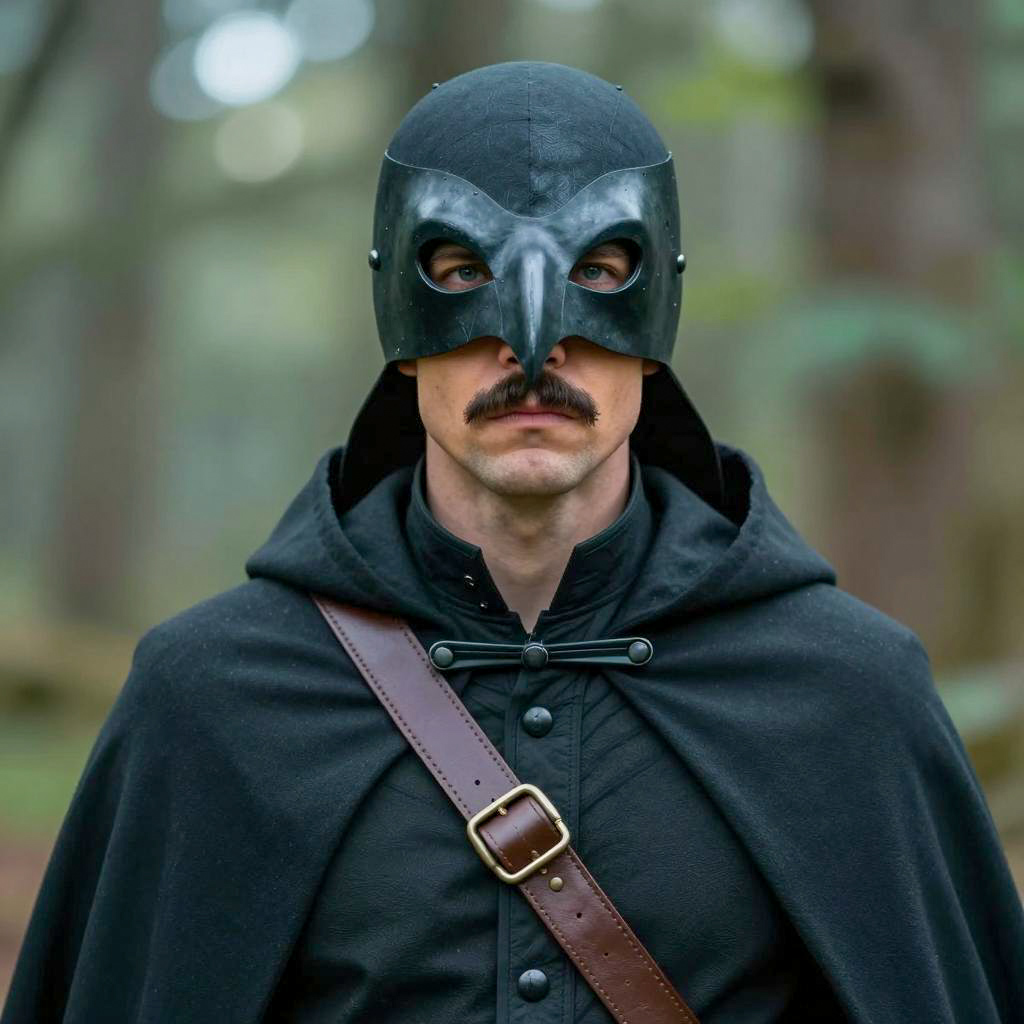 Portrait of a man wearing a black bird-like mask and black cloak with a brown leather strap across his chest. The man has a dark mustache and serious expression. The photo is taken outdoors with a blurred green and blue forest background in natural light, showcasing a fantasy theme with high detail in a cinematic style.