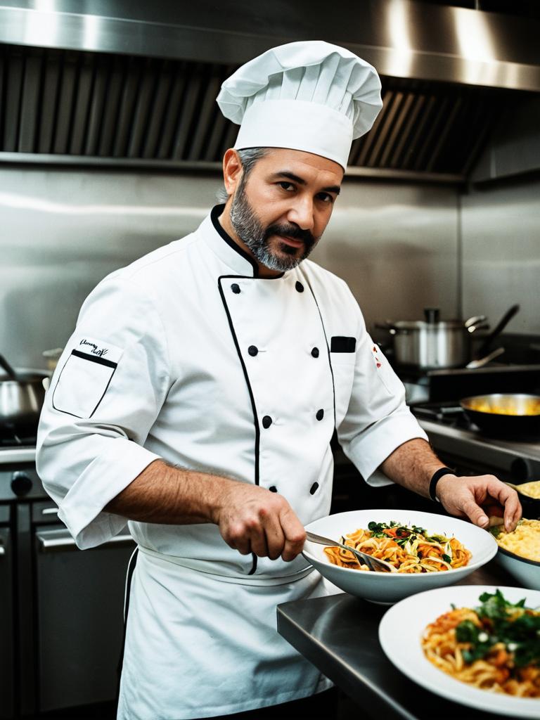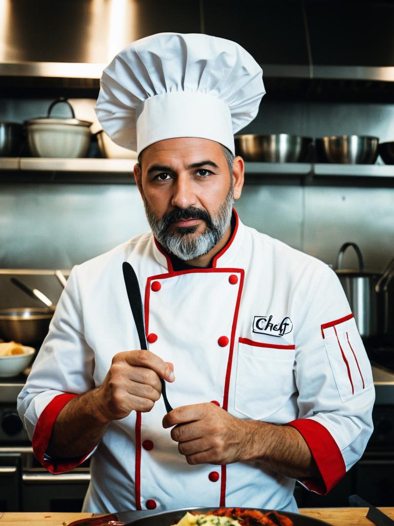 Man in Chef Costume, photorealistic culinary cosplay portrait, cinematic realism