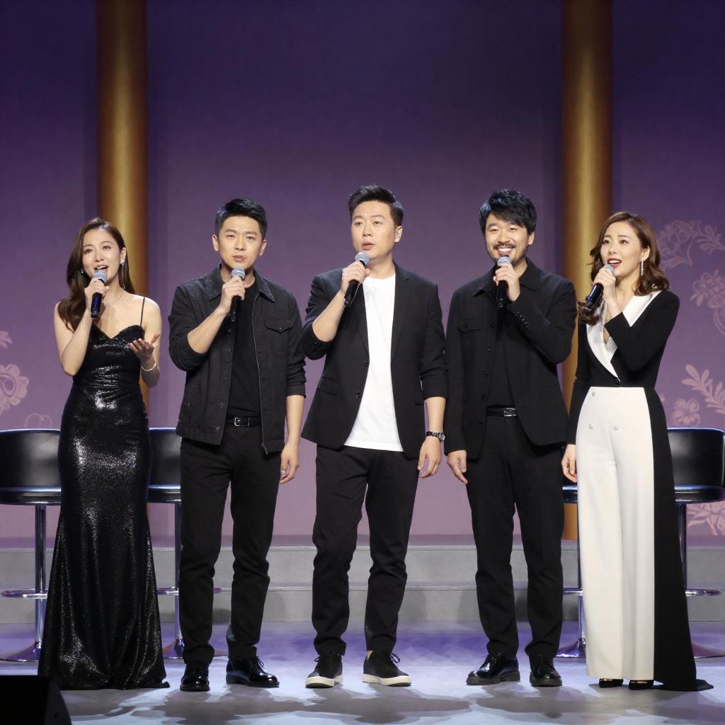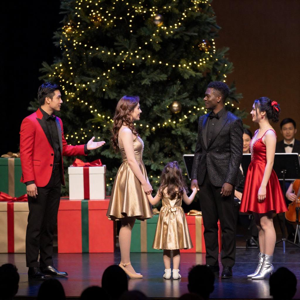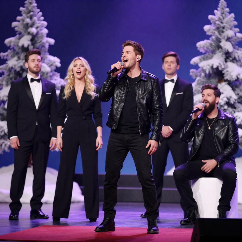 Five performers on stage, singing, standing in front of large, lit Christmas trees. Four wearing festive outfits, one in red blazer and black pants, others in red and black dresses with sparkles. Stacked gift boxes below. Audience clapping. Warm stage lighting. Performers raising hands. Background trees with purple and white lights. Performer with short hair on left, blonde in center, brunette on right, another in black on far right.