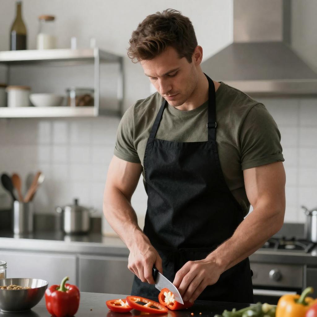 Photograph of a muscular man with short brown hair, olive green shirt, and black apron, slicing red bell peppers on a black counter in a modern kitchen. He has a focused expression. Stainless steel shelves and kitchen tools in the background.