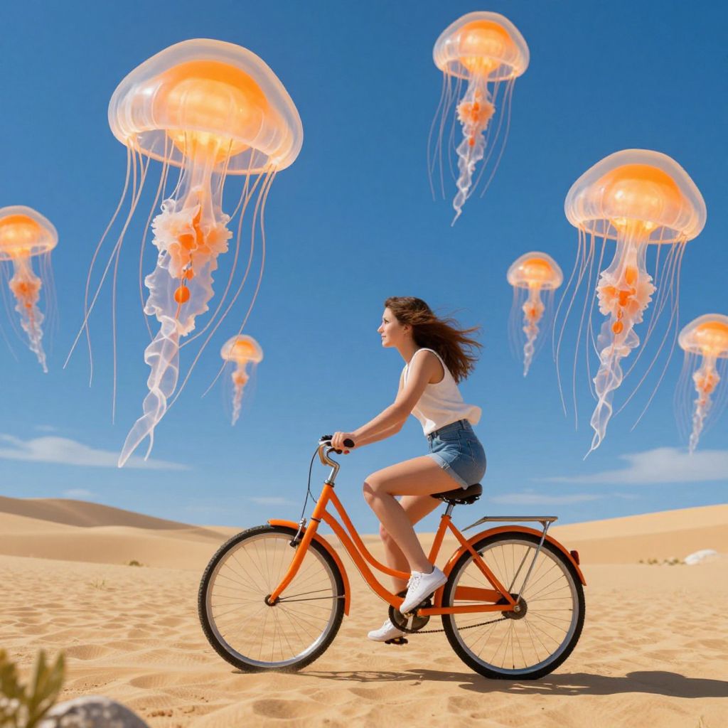 Photograph-style digital artwork of a young woman with long brown hair riding an orange bicycle through a bright, sandy desert. She wears a white tank top, denim shorts, and white sneakers. The vivid blue sky is adorned with six glowing, orange jellyfish with translucent, umbrella-shaped tops and long, wavy tentacles, floating above her. The sand dunes stretch into the background, and the image blends surreal elements with realistic textures, creating a dreamlike scene. The woman is positioned in profile, facing right, with a focused expression.