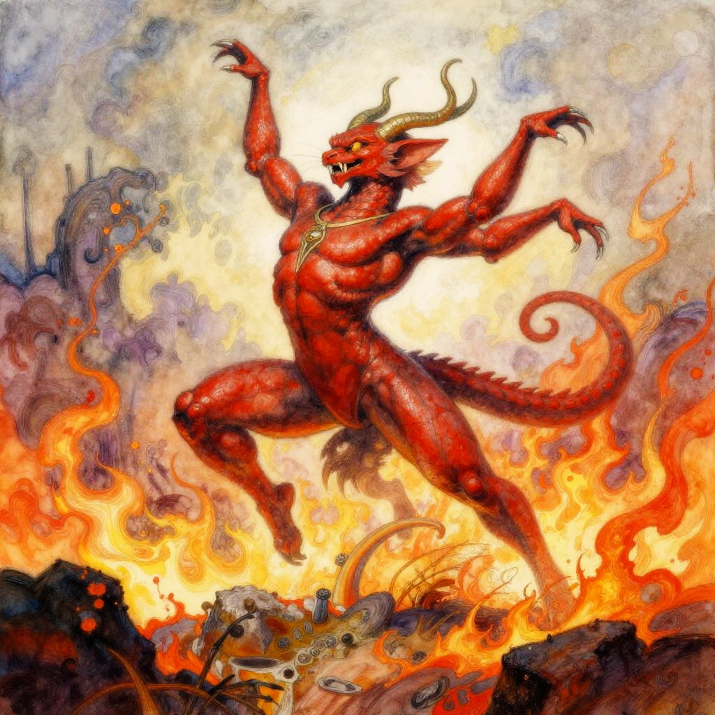 A dancing crimson manticores, legendary and magical, set in burning wasteland, inspired by Frank Frazetta, Gustave Moreau, Rebecca Guay, vibrant colors, highly detailed with watercolored pencil texture.