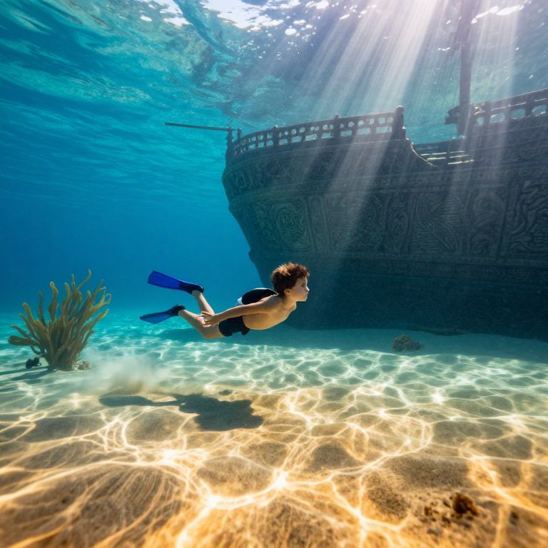 Create an idyllic underwater scene reminiscent of dreamlike landscapes, depicting a young explorer venturing into a captivating marine world. Radiant beams of sunlight filter through the transparent water, illuminating the golden sand below with mesmerizing patterns, as the gentle swaying of aquatic vegetation adds a whimsical touch to this enchanting environment. In the background, an ancient ship with intricate carvings partially submerged in the depths suggests untold stories and mysteries waiting to be discovered beneath the surface, inviting viewers to share the boy's sense of wonder and curiosity as he embarks on his adventures in this harmonious blend of realism and imagination.