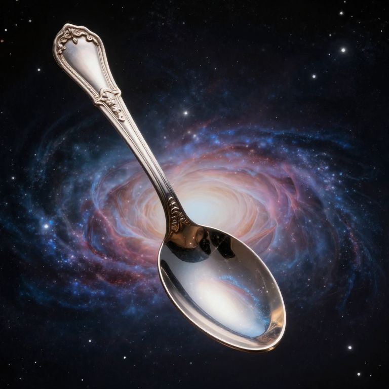 A reflective silver spoon with ornate handle floats in space, with a vibrant, colorful spiral galaxy behind it. Digital artwork.