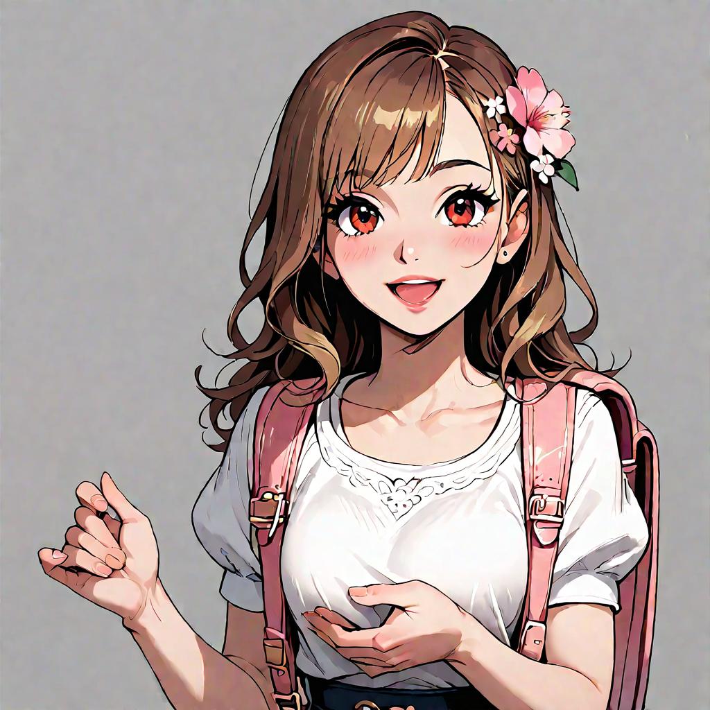 Score_9, score_8_up, score_7_up, source_anime, rating_explicit, uncensored, 1girl, gyaru, :d, backpack, bag, brown eyes, brown hair, collarbone, eyelashes, flower, grey background, hair flower, hair ornament, hands up, holding, holding bag, long hair, looking at viewer, open mouth, outdoors, pink flower, puffy short sleeves, puffy sleeves, shirt, short sleeves, simple background, smile, solo, teeth, upper body, upper teeth only, white shirt