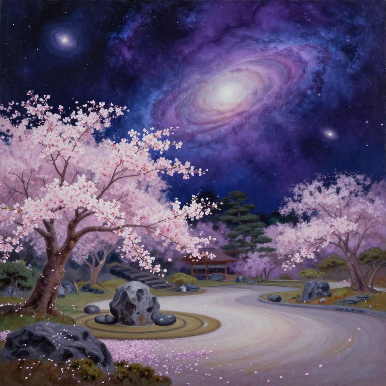Imagine an enigmatic oil painting that merges the serenity of a Japanese garden with the vastness of space. In the foreground, cherry blossoms bloom alongside a Zen rock garden, their delicate petals reflecting the gradient of deep indigo to vibrant violet sky above. The scene then transitions into an ethereal view from above, revealing a cosmic landscape filled with nebulae and distant galaxies, as if nature and cosmos are in harmony. This dreamlike fusion captures both tranquility and wonder, reminiscent of surrealist artistry that blends the familiar with the fantastical, evoking a sense of balance between earthly beauty and celestial mystery.