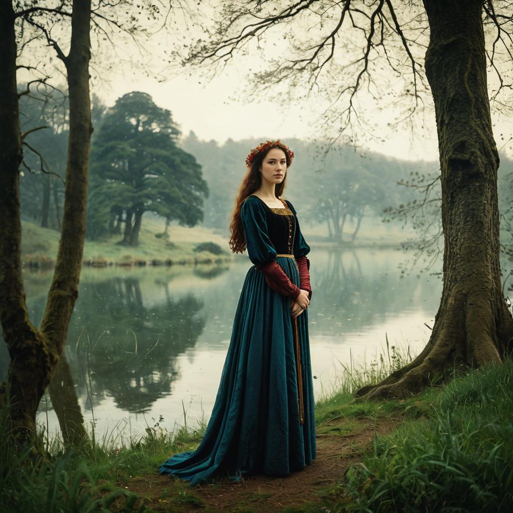 A young woman with long red hair wearing a traditional medieval dress with a blue skirt and white blouse stands beside a tranquil lake surrounded by ancient, large trees. She wears a floral wreath and looks towards the camera with a serene and wistful expression. The scene is enveloped in soft, diffused lighting with a misty, ethereal atmosphere highlighting the calmness and natural beauty of a wooded glade.